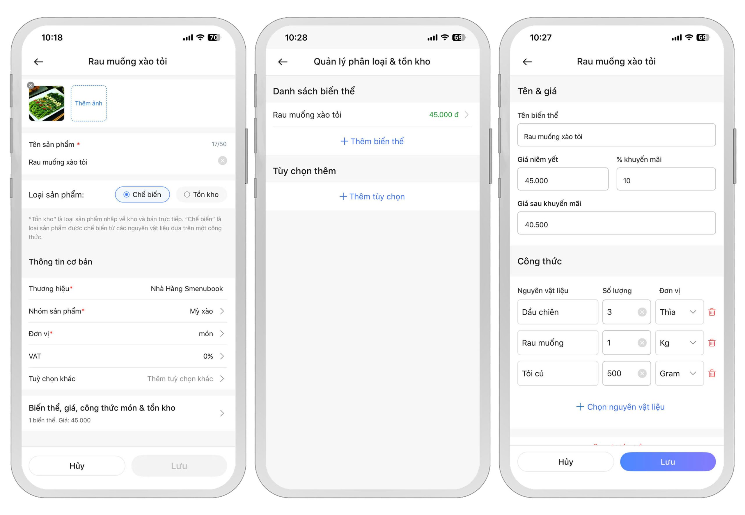2. Nhấn vào Biến thể, giá, công thức món & tồn kho