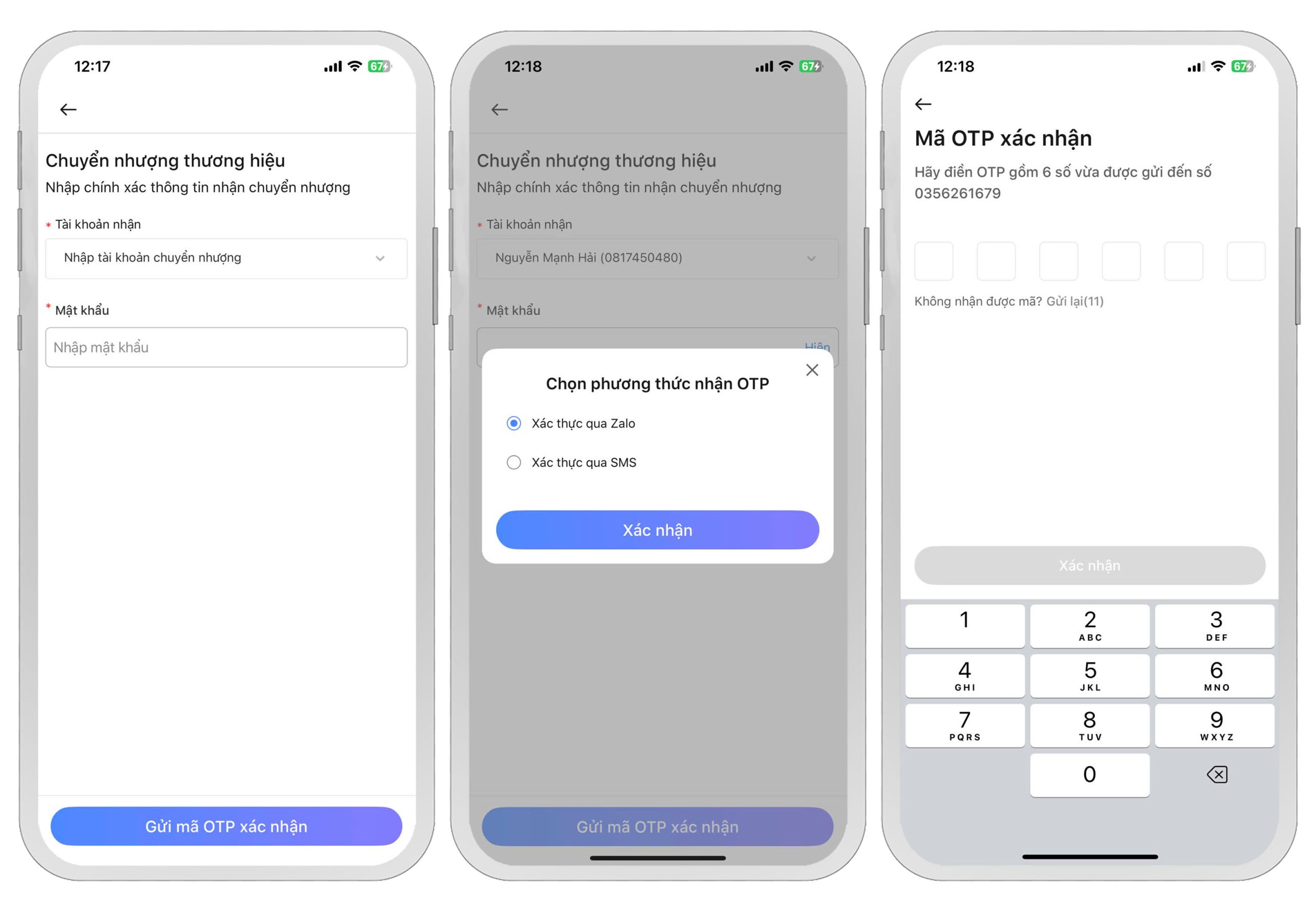 • Sau đó, hệ thống sẽ yêu cầu bạn nhập số điện thoại của tài khoản nhận chuyển nhượng, nhập mật khẩu và nhấn vào “Gửi mã OTP xác nhận”. Khi nhận được mã OTP, bạn nhập mã vào ô tương ứng rồi nhấn “Xác nhận”. Ngay sau khi hoàn tất, thương hiệu được chuyển nhượng sẽ xuất hiện trong mục Thương hiệu của tôi của tài khoản nhận.