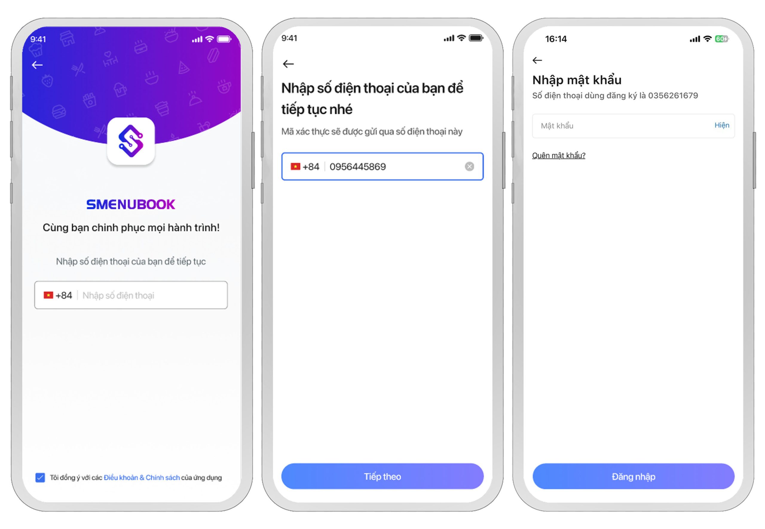 Bước 1: Đầu tiên bạn mở ứng dụng Smenubook lên, ở màn hình Trang chủ nhấn chọn Đăng nhập. Sau đó nhập số điện thoại, nhấn chọn Tiếp theo. Cuối cùng bạn nhập mật khẩu và nhấn Đăng nhập.