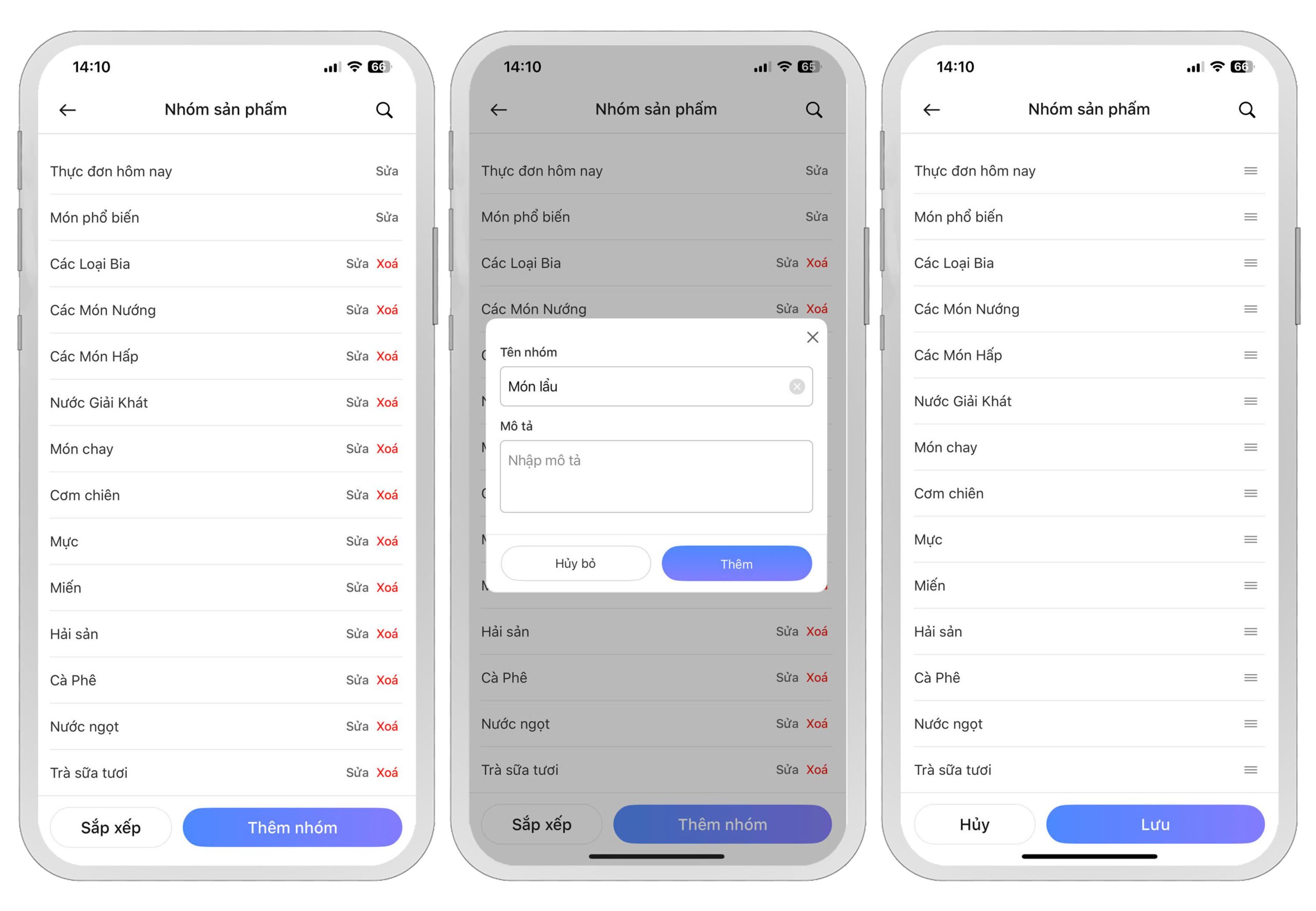 Nhóm sản phẩm: Gom nhóm các món ăn (ví dụ: Lẩu, Đồ nướng, Hải sản…).