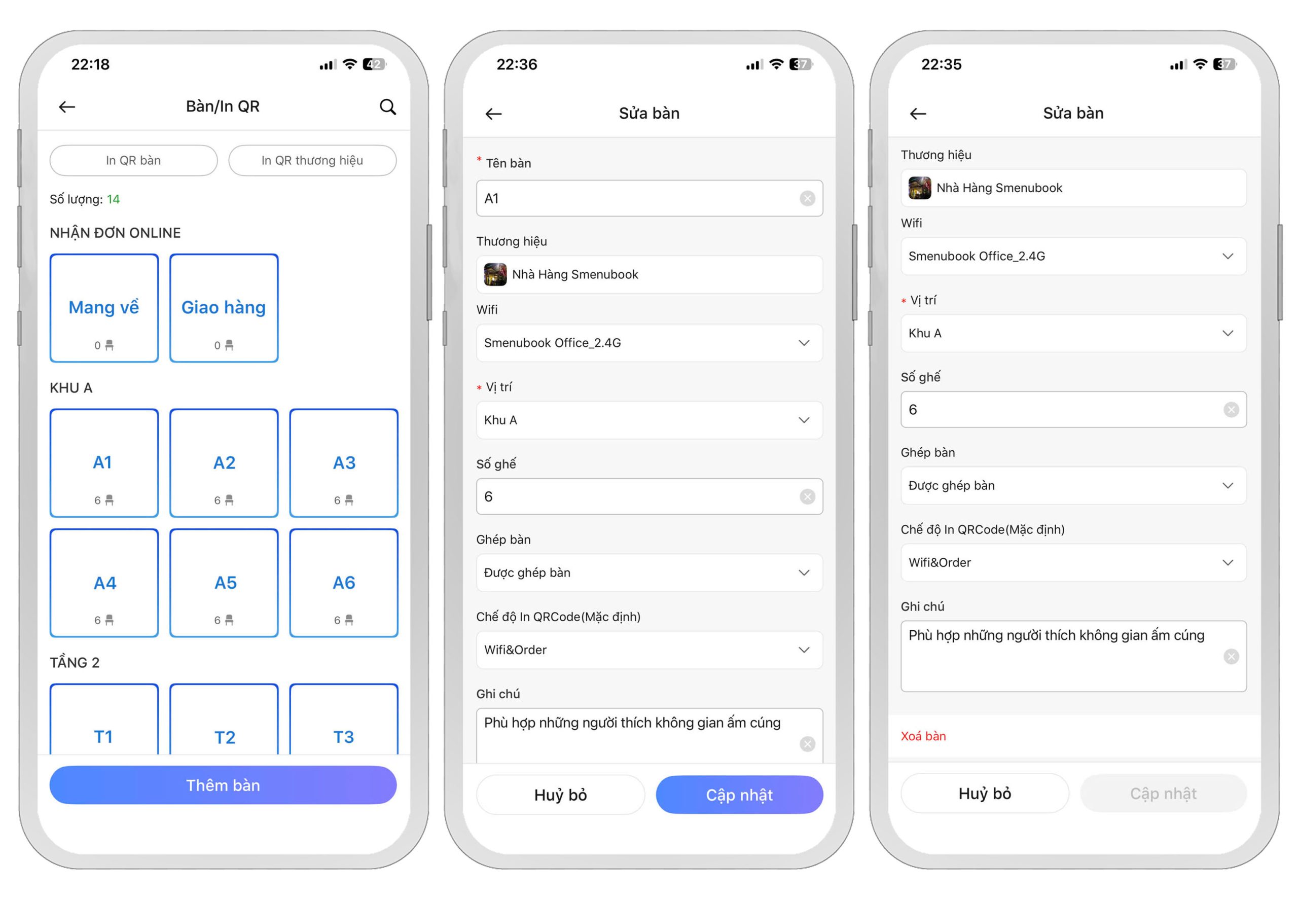 Vào mục Phòng Bàn & In QR, tìm đến phòng/bàn cần chỉnh sửa hoặc xóa, sau đó sửa thông tin bàn rồi nhấn vào nút Cập nhật hoặc nhấn vào nút Xóa bàn để xóa là xong.