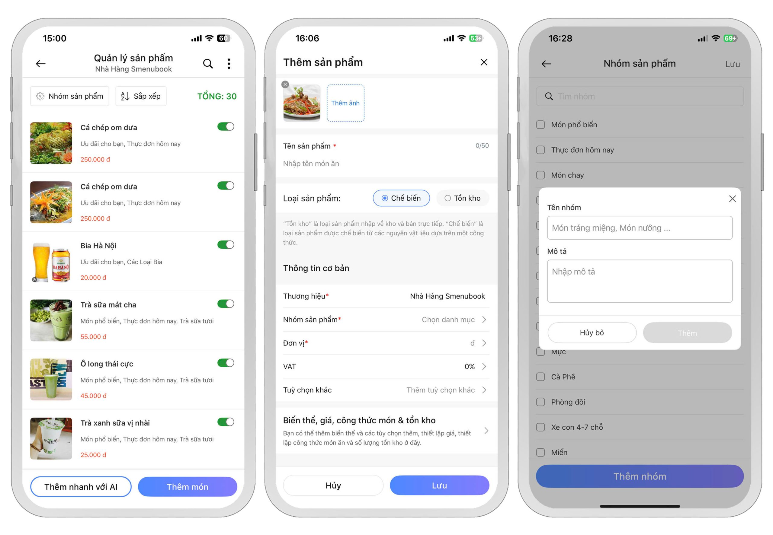 Tại trang Tài khoản, bạn chọn mục Sản phẩm, sau đó nhấn Thêm món. Tiếp theo, điền đầy đủ các thông tin như: Tên sản phẩm, hình ảnh, nhóm sản phẩm, giá và các thông tin khác. Cuối cùng, nhấn Lưu để thêm sản phẩm vào danh sách.