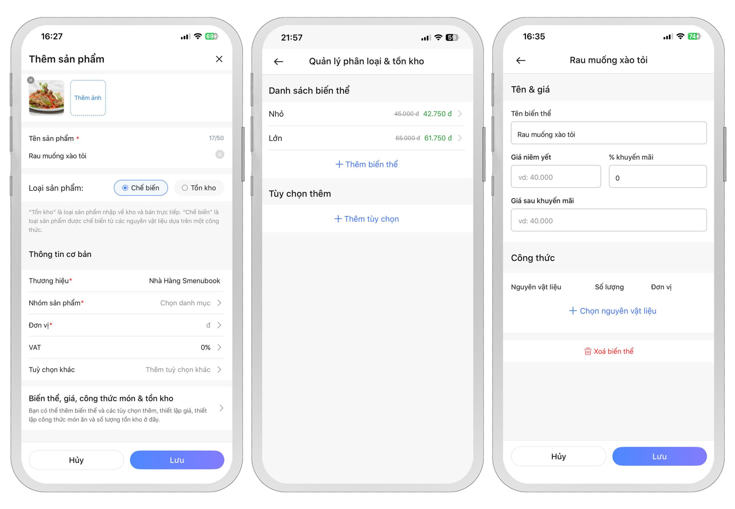 Tiếp theo, vào mục Biến thể, giá, công thức món & tồn kho để thêm biến thể nếu sản phẩm có nhiều phân loại (ví dụ: Loại cao, Loại lùn) và nhập giá bán tương ứng cho từng loại.