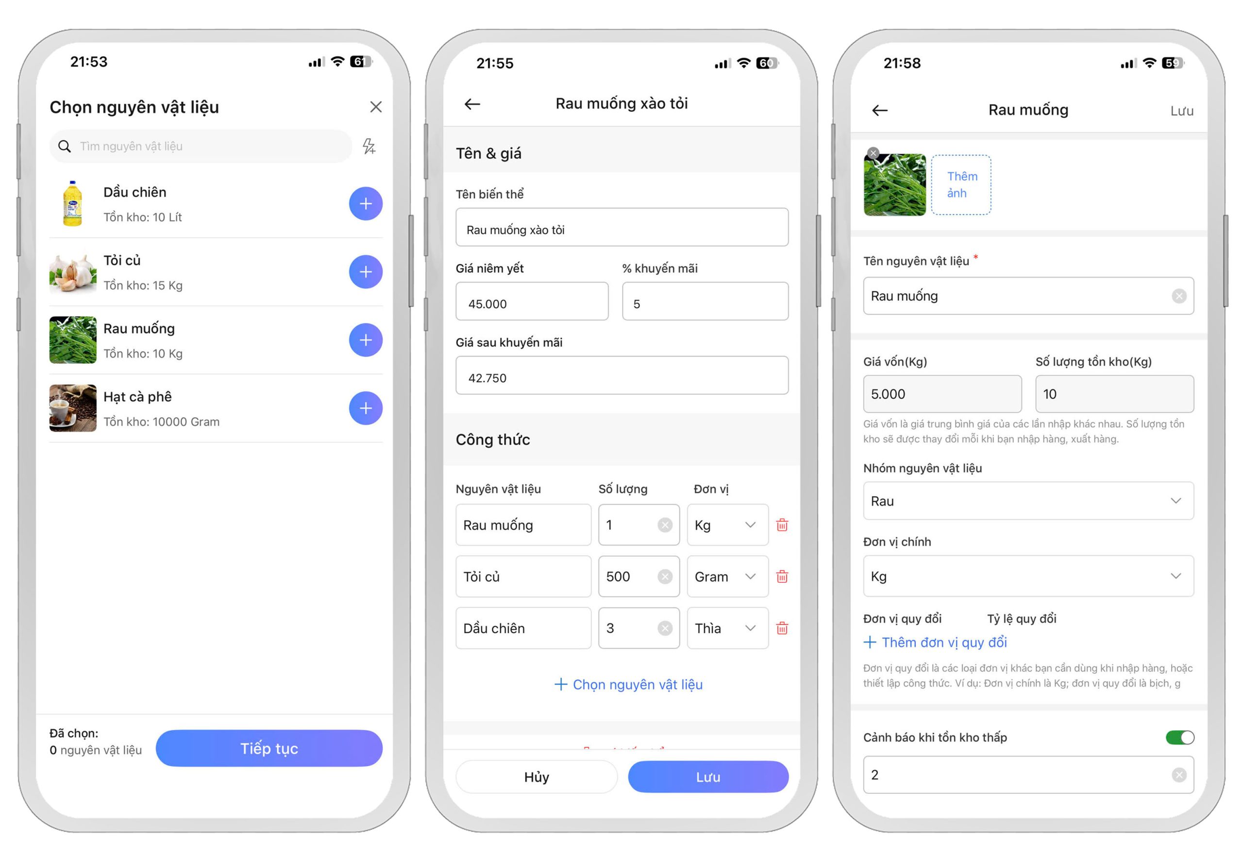 Nếu nguyên vật liệu bạn cần không có trong danh sách, hãy nhấn vào biểu tượng tia sét ⚡ để thêm nhanh nguyên vật liệu. Ngoài ra, bạn cũng có thể vào mục Quản lý kho để thêm nguyên vật liệu cho cửa hàng một cách đầy đủ hơn.