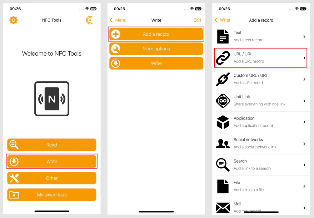 Bạn vào mục Write > Chọn Add a record > URL/URI > Dán link Scard copy ở bước 2 vào > Bấm OK > Sau đó bấm Wrire rồi tiến hành đưa thẻ NFC vào mặt sau điện thoại để ghi, vậy là xong.