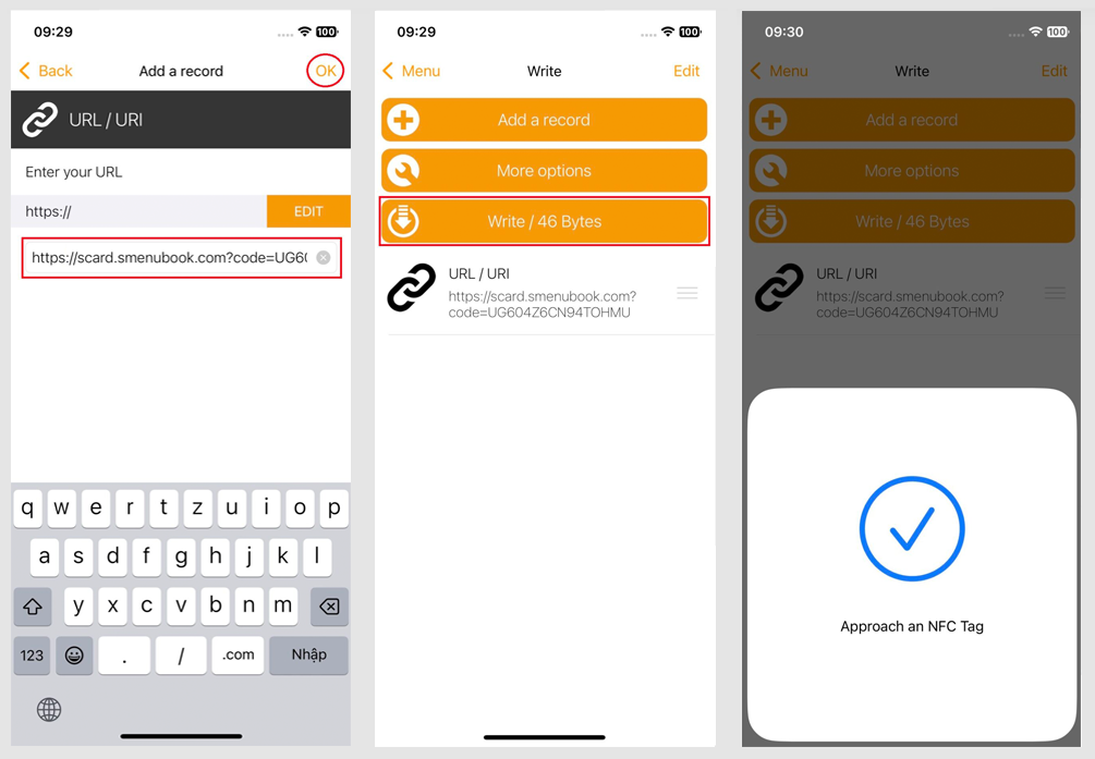 Chọn Edit > Dán link Scard > OK > chọn Write > Áp thẻ NFC để ghi