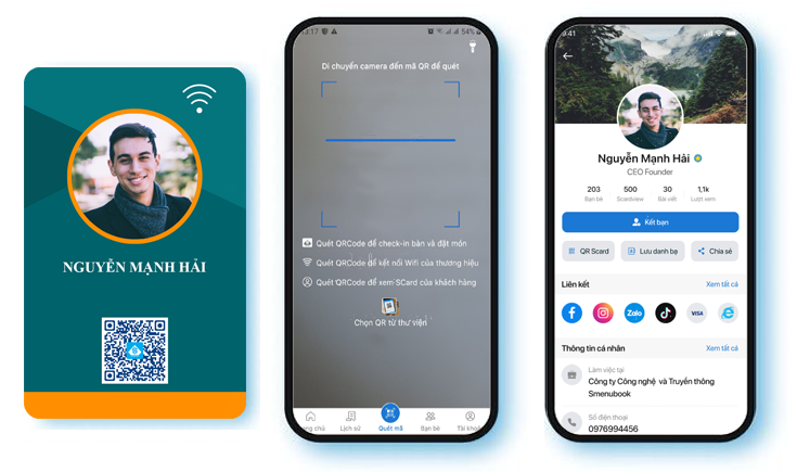 Chỉ cần chạm thẻ Scard NFC vào mặt sau của điện thoại bạn bè hoặc đối tác thì toàn bộ thông tin bạn muốn chia sẻ, sẽ được hiển thị lên điện của người đó.