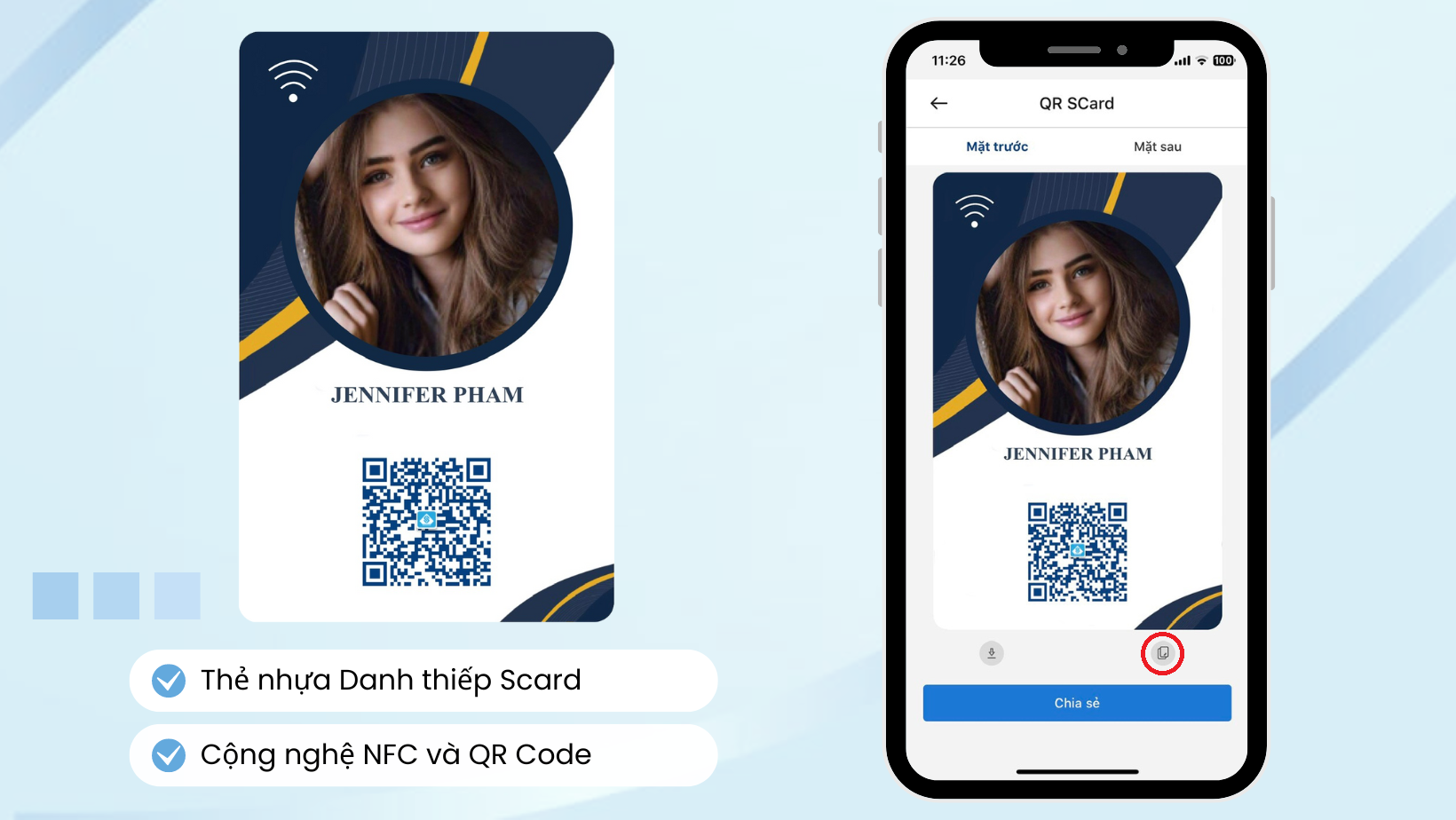 Với kích thước bằng thẻ ngân hàng, Chỉ một lần chạm SCard giúp bạn lan tỏa dấu ấn cá nhân của mình dễ dàng hơn bao giờ hết.